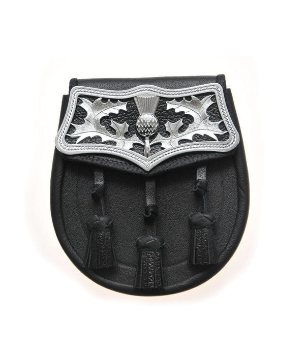 Scottish made black leather sporran with three knotted leather tassels featuring a large thistle design plate on the lid.