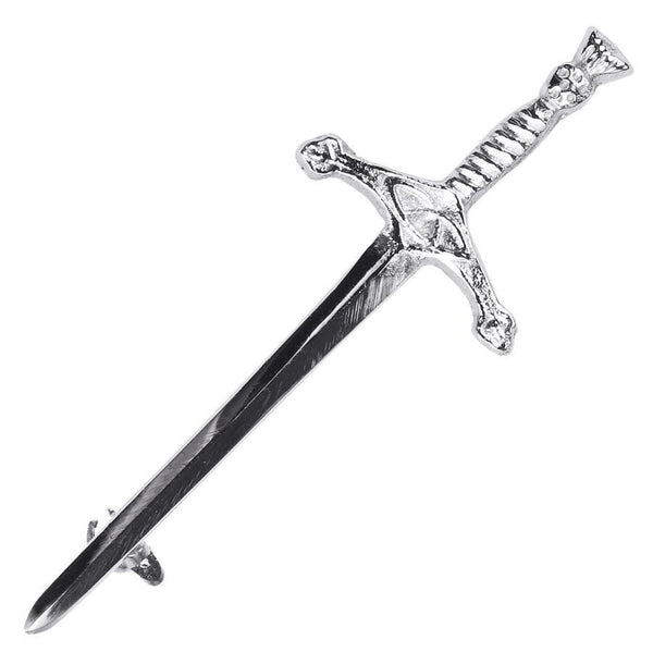 This well-crafted kilt pin is 100% steel, and comes in a chrome finish. The model for the pin is a Broadsword, with intricate details around the hilt and a well-polished blade. The pin measures 3" long and 1" wide.