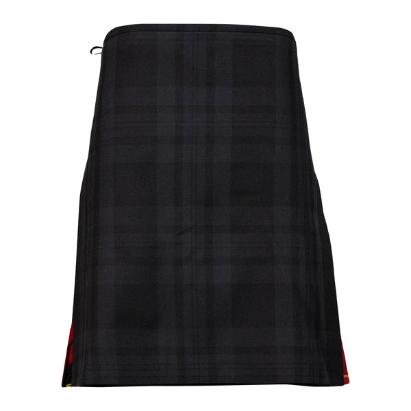 This kilt is an 8 Yard Contrast kilt made in the Black Isle and Wallace Modern tartans with 16oz fabric and is made to sett. The back of the kilt features the alternating knife pleats of the two tartans and a contrasting Wallace Modern fringe down the side of the apron.