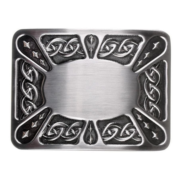 This contemporary styled kilt belt buckle features a Celtic knot-work pattern overlaid by a diamond design, all surrounding an oval shaped mirror.