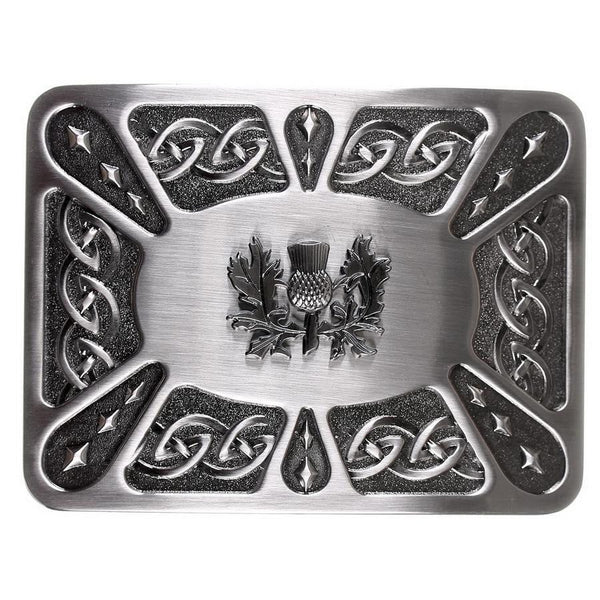 This contemporary styled kilt belt buckle features a Celtic knot-work pattern overlaid by a diamond design, all surrounding a raised Scottih thistle.