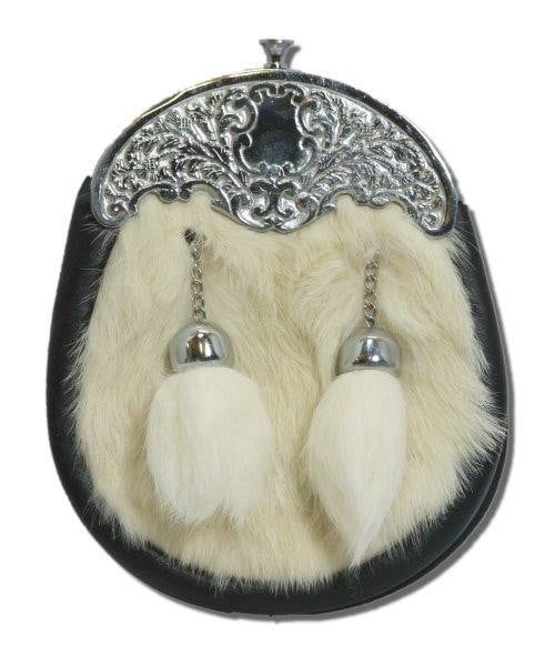 This beautifully designed sporran is the perfect finish to your childs kilt outfit! Made from rabbit fur and features an ornate chrome cantle. The cantle features stunning engravings of thistles with a mirror design in its centre. The sporran features two rabbit fur tassels with metal fasteners to them in place. This sporran measures 5.5 inches wide and 6 inches in length. As with all our children's sporrans, this comes with a chain belt.