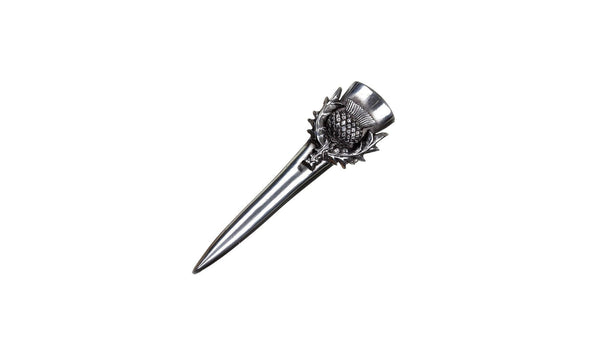 Simplisitc sword design kilt pin with large thistle emblem made from 100% pewter.