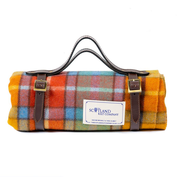 Leather carrying strap for tartan blankets.
