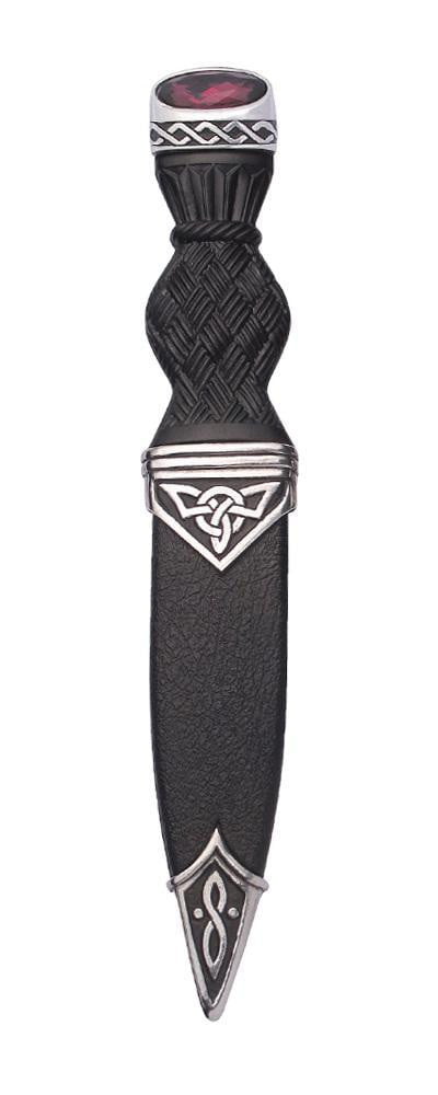 An exquisite sgian dubh with a polished finish to the pewter fittings which feature Celtic interlace designs. The handle is available with a choice of five stone colours and the stainless steel blade is blunted for safety.