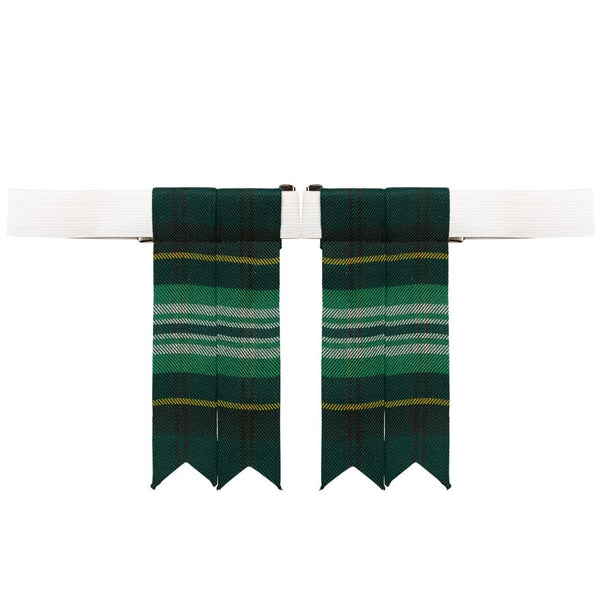 These tartan kilt hose flashes come with elasticated garters with velcro fastening and are made form 100% durable polyviscose wool. The garters will fit any adult leg size.