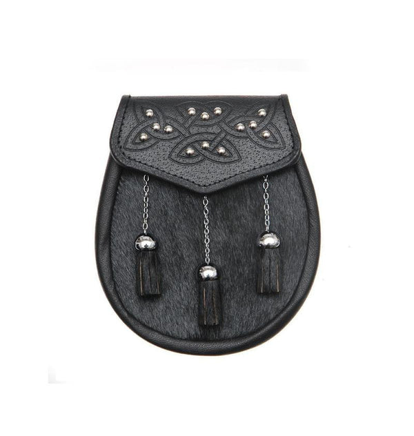 This semi dress sporran has a black calfskin skin body with three matching chrome cap chain tassels. The lid in embossed black leather and has chrome studs. Perfect for semi formal occasions.