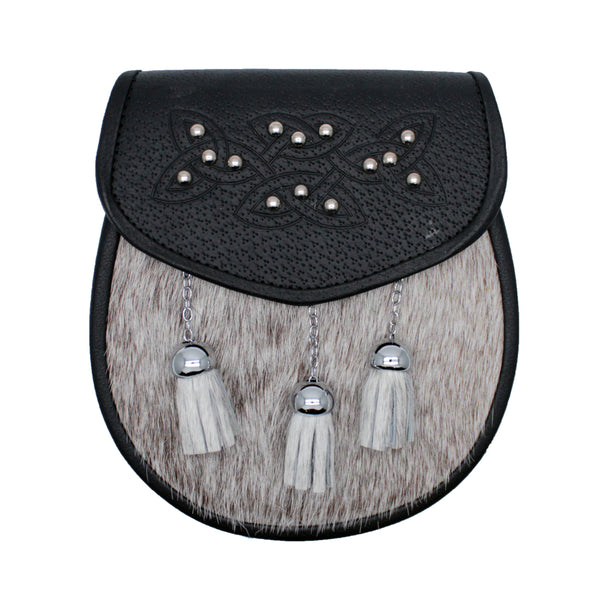 Scottish made semi dress sporran in grey calfskin with 3 matching chain tassels featuring a celtic interweave design on the lid.