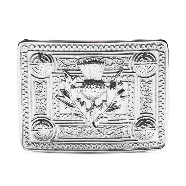 This steel kilt buckle has a high polish chrome finish. The thistle emblem is at the center and is surrounded by a celtic knot border.