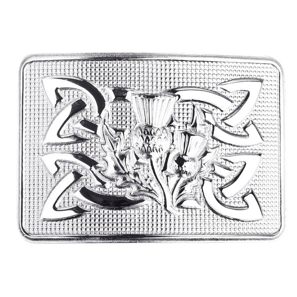 100% steel kilt belt buckle with a celtic twist pattern and a central thistle emblem in chrome finish.