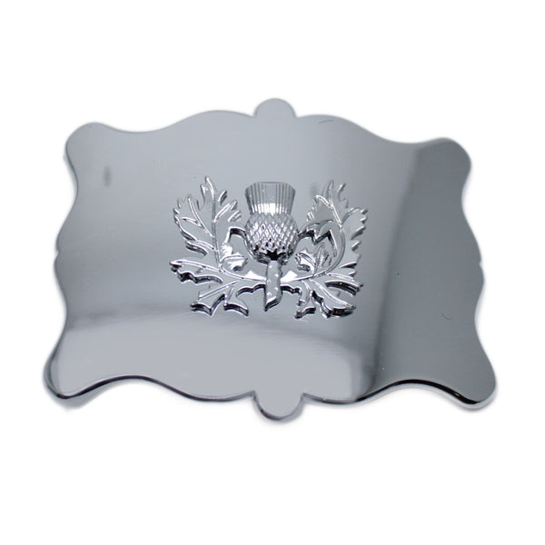 A 100% steel, chrome finish kilt belt buckle in an intricate scallop design with a central thistle emblem.
