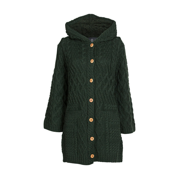 Beautiful women's hooded cardigan made from 100% merino wool with traditional cable aran pattern.