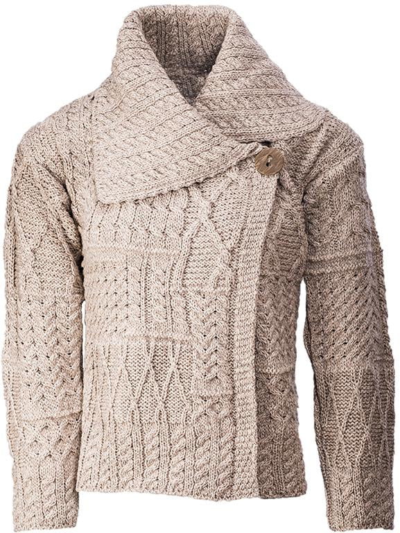 Women's cardigan made from 100% merino wool with single button collar and mixed diamond and cable design.